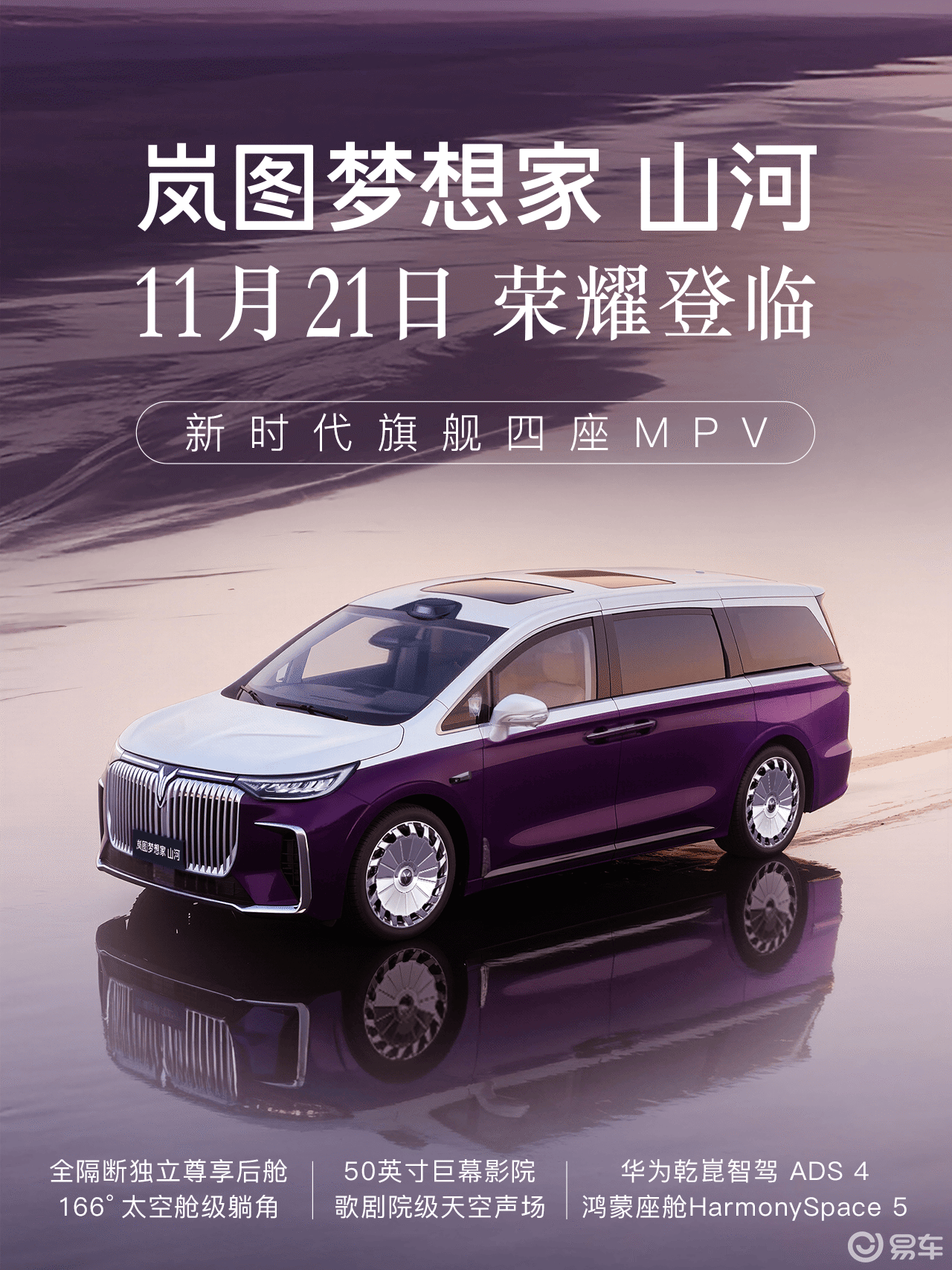 在現有產品矩陣基礎上,嵐圖將于11月21日廣州車展推出旗艦四座MPV——夢想家山河。這款定位時代精英的新車融合東方美學與現代科技,皓月紫云博雅雙色車身搭配高定星漩輪轂彰顯尊貴氣質。創新設計的"山河云榻"行政座椅提供舒展模式,配合50寸超清巨幕、丹拿殿堂級音響及雙冷暖冰箱,構建起移動的奢雅空間。作為首款搭載華為乾崑智駕ADS 4的四座MPV,該車型將開啟智能豪華出行的新紀元。