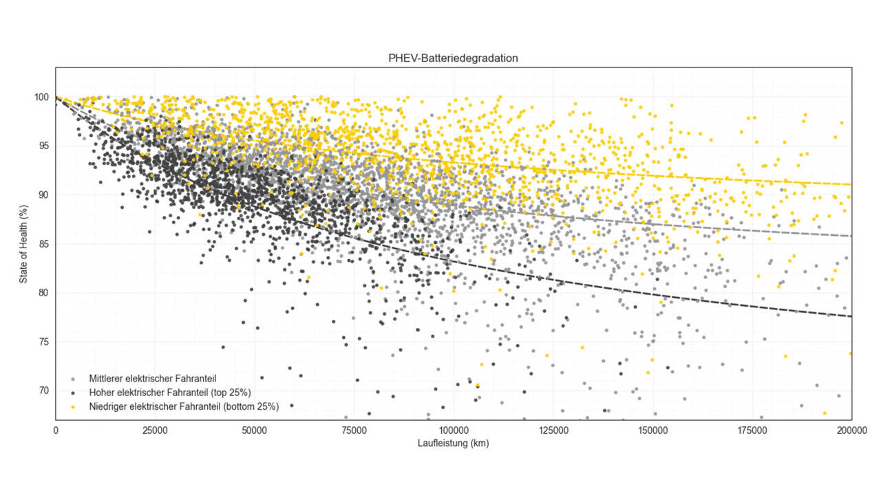 研究顯示,各品牌PHEV電池表現呈現顯著差異。梅賽德斯-奔馳車型展現出卓越的穩定性,其電池性能衰減與純電使用頻率無關,始終以漸進式下降。即便行駛20萬公里后,電池健康狀態仍優于多數競品,成為測試中最可預測的品牌。