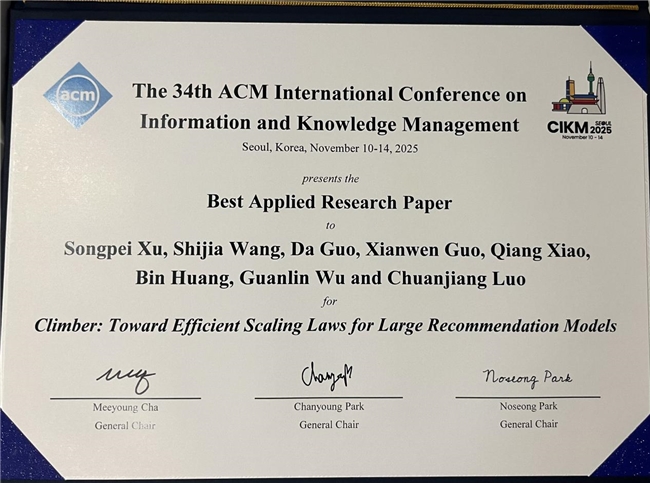 當(dāng)日,韓國首爾,CIKM 2025頒獎典禮現(xiàn)場,網(wǎng)易云音樂算法團隊?wèi){借生成式推薦大模型Climber榮獲大會“Best Applied Paper Award”最佳論文獎,獲獎概率不到千分之三。該獎項評選標(biāo)準(zhǔn)極嚴(yán),需經(jīng)全球頂尖學(xué)者多輪評議,要求論文在理論深度、技術(shù)創(chuàng)新、實驗嚴(yán)謹(jǐn)、寫作質(zhì)量及產(chǎn)業(yè)落地等維度全面領(lǐng)先。今年與網(wǎng)易云音樂同臺競技者包括Google、Amazon、meta、Microsoft、Airbnb、字節(jié)、騰訊、阿里、快手等全球科技巨頭,以及MIT、Stanford、CMU、清華、北大等世界頂尖高校,競爭異常激烈。