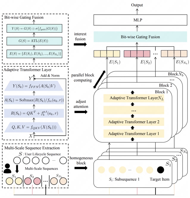 網(wǎng)易云音樂生成式推薦大模型“Climber”的核心思路是基于推薦場景的特點,重構(gòu)Transformer的關(guān)鍵模塊。具體來說,它包含三大核心創(chuàng)新組件:多尺度序列提取(MSE)、自適應(yīng) Transformer層(ATL)、逐位門控融合(BGF)。這三個組件環(huán)環(huán)相扣,分別解決“長序列計算效率”、“多場景適配”、“多興趣融合”的問題。