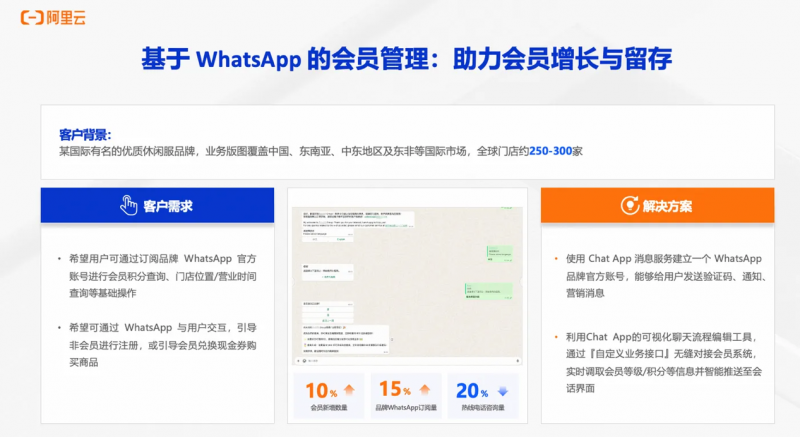 某國(guó)際知名休閑服裝品牌,使用 Chat App 消息服務(wù)建立了一個(gè) WhatsApp 品牌官方賬號(hào),向用戶發(fā)送驗(yàn)證碼、通知、營(yíng)銷消息,同時(shí)無縫對(duì)接了其會(huì)員系統(tǒng),實(shí)時(shí)調(diào)取會(huì)員等級(jí)/積分信息并推送至?xí)捊缑妫瑢?shí)現(xiàn)品牌 WhatsApp 訂閱量提升 15%,會(huì)員新增數(shù)量提升 10%。