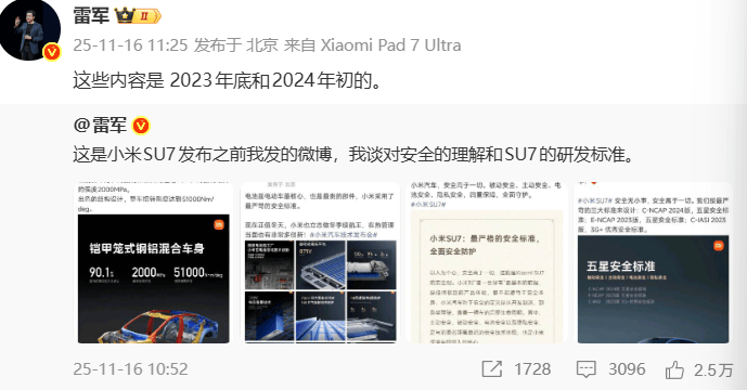 爭議焦點源于雷軍此前關于產品設計的公開表述。他解釋稱,去年4月采訪中提及“車輛外觀重要性”的言論,與“安全是基礎”的原則并不沖突。針對輪轂設計難度的討論,他也強調這是技術層面的專業觀點,卻被部分網友刻意曲解。為駁斥不實信息,雷軍特意曬出四則歷史微博截圖,其中2023年12月28日的發文明確指出:“電池作為電動車最核心部件,小米采用了行業最嚴苛的安全標準。”