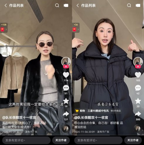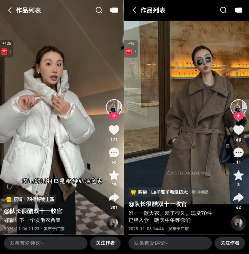 自8月起,張丹就開始為雙11進行備貨,從選品、材料、生產等全鏈路,為大促爆發打好堅實基礎。在貨品選擇上,張丹為粉絲提供了三星90鵝絨的鵝絨服,大牌專柜風格及材質的大衣、浙江海寧最尖端的水貂等眾多高端產品。在經營節奏上,隊長很酷在大場前五六天開始發布預熱視頻,進行人群蓄水和直播引流。在直播時長上,每個大場達12個小時。