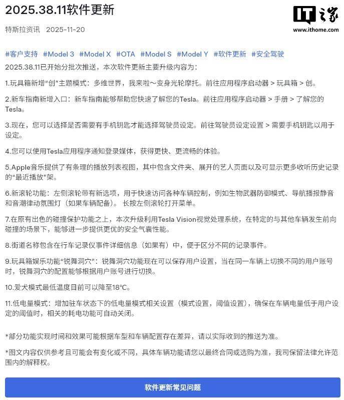 特斯拉中國近日面向Model 3、Model Y、Model S及Model X四款車型,正式啟動2025.38.11版本軟件的分批推送工作。此次更新涵蓋車輛控制、娛樂系統、安全防護及能源管理等多個領域,為用戶帶來更智能、便捷的駕駛體驗。