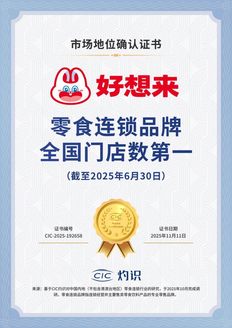 近日,專業(yè)咨詢公司CIC灼識咨詢頒發(fā)市場地位確認(rèn)證書,稱經(jīng)對中國內(nèi)地(不包含港澳臺地區(qū))零食連鎖行業(yè)的研究,截至2025年6月30日,萬辰集團(tuán)旗下量販零食品牌好想來全國門店數(shù)量位列零食連鎖品牌第一。