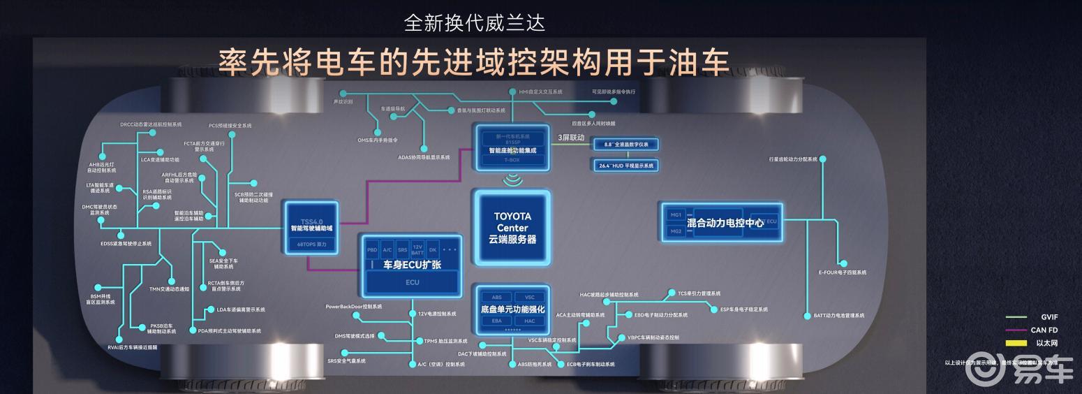 作為豐田首款搭載域控制器的燃油車型,全新威蘭達通過集中式電子電氣架構實現算力整合。其核心采用高通驍龍8155P芯片,配合千兆以太網實現毫秒級數據傳輸,支持整車FOTA與SOTA遠程升級功能。這一技術突破有效解決了傳統燃油車智能化迭代周期長的痛點,為燃油車智能化發展提供了新思路。