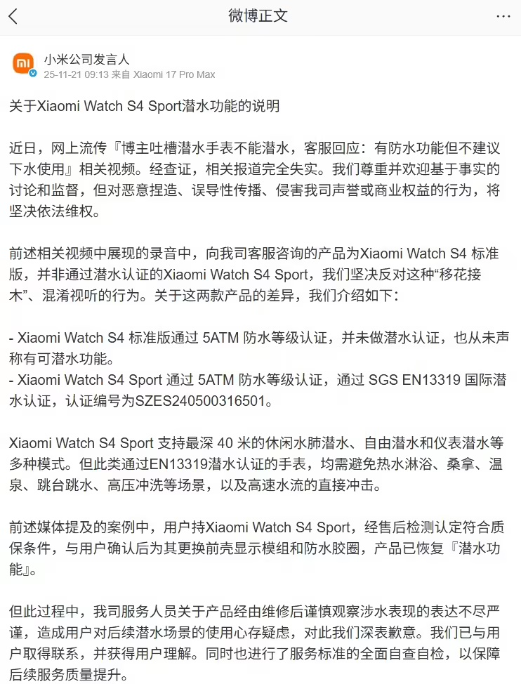 聲明指出,視頻中客服咨詢的產品實際為Xiaomi Watch S4標準版,而非具備專業潛水認證的Xiaomi Watch S4 Sport。兩款產品存在本質差異:標準版僅通過5ATM防水等級認證,未進行潛水功能認證;而Sport版本不僅通過5ATM認證,還獲得SGS EN13319國際潛水認證(編號SZES240500316501),支持最深40米的休閑水肺潛水、自由潛水及儀表潛水等多種模式。