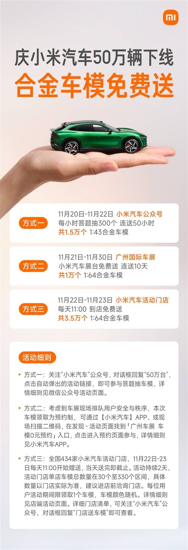 具體領(lǐng)取方式分為三類:其一,通過"小米汽車"官方微信公眾號參與答題互動抽獎,每小時放出300個名額,持續(xù)50小時,總計(jì)1.5萬個;其二,2025廣州車展期間,每日在小米汽車展臺現(xiàn)場發(fā)放1000個,連續(xù)10天共計(jì)1萬個;其三,全國小米汽車活動門店將開放3.5萬個車模的免費(fèi)領(lǐng)取通道。