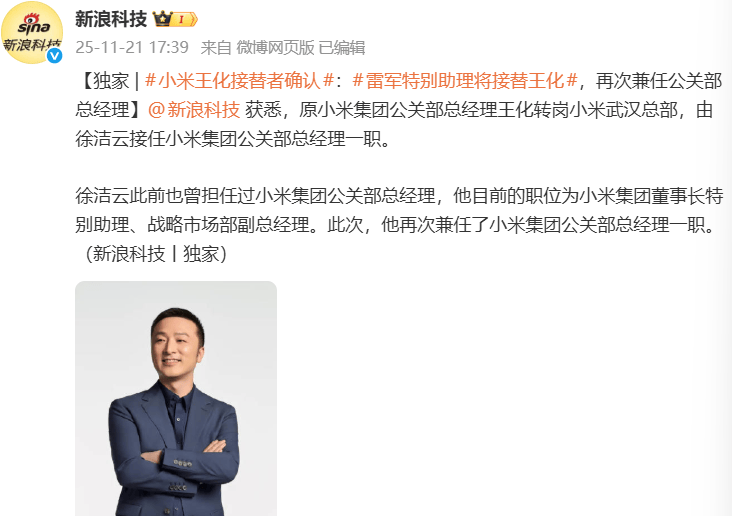 據新浪科技報道,小米集團近期迎來重要人事調整,原公關部總經理王化已調任武漢總部,其職位由徐潔云接任。這一變動引發外界廣泛關注,尤其是在小米汽車近期面臨輿論風波的背景下,更被解讀為應對危機的策略之一。