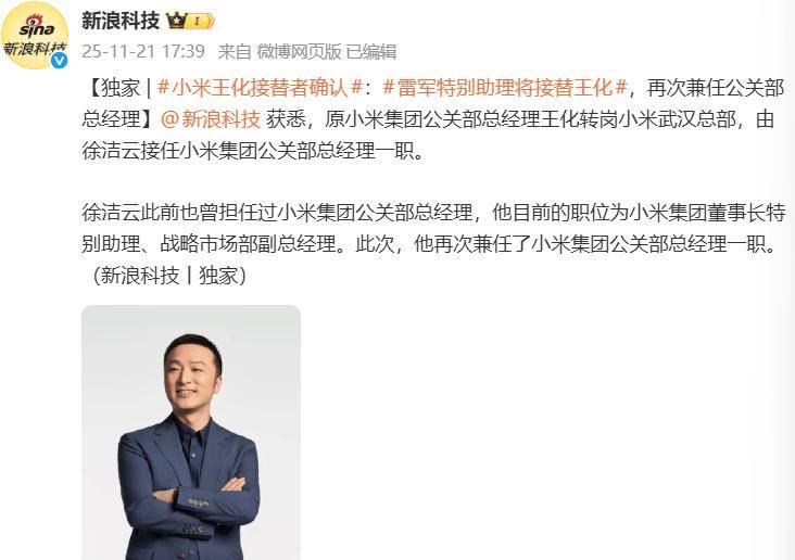 據媒體披露,小米集團近日完成了一次重要的人事調整。原集團公關部負責人王化已調任武漢總部,其職位由徐潔云接任。徐潔云此前曾擔任過該職務,目前還兼任集團戰略市場部副總經理及董事長特別助理。