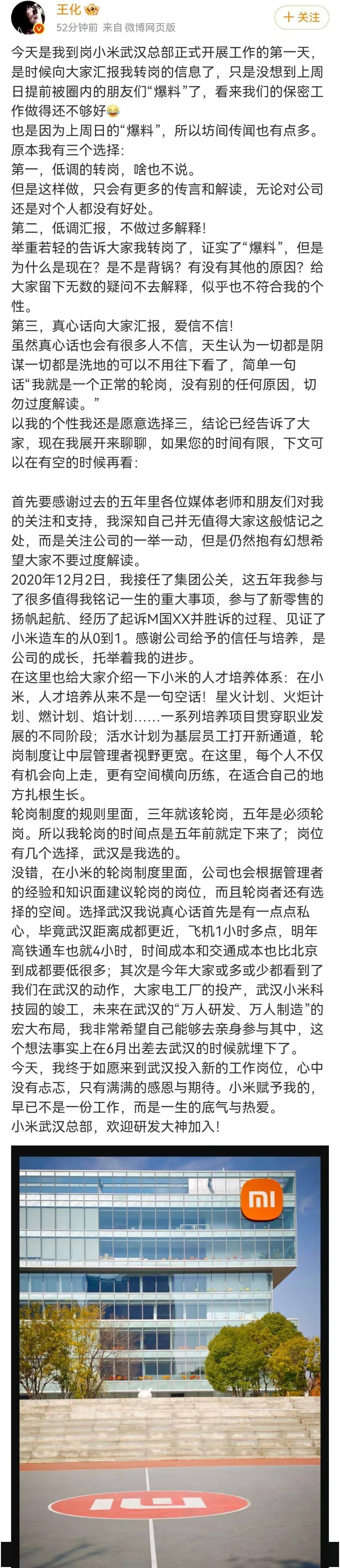 王化在社交平臺公開回應稱,此次調動屬于正常輪崗安排,與近期輿論事件無關。他透露,選擇武漢總部部分出于個人考量——該地與家鄉成都距離較近,可降低通勤成本。同時他提到,小米在武漢的布局正逐步深化,包括新建科技園區和投產家電工廠,未來將形成"萬人級"研發制造基地。根據集團制度,管理人員每五年需進行崗位輪換,此次調動實際是五年前制定的計劃。