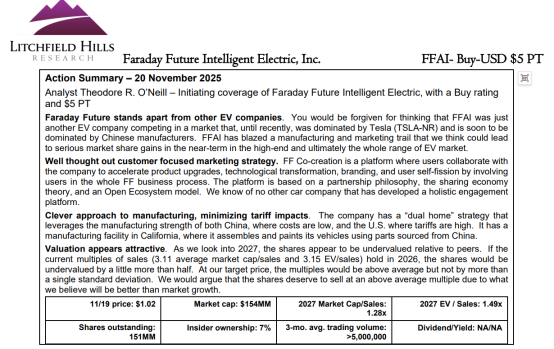 Litchfield Hills Research報告截圖:該機構認為FF當前股價與市值均處于“明顯低估”狀態,給予FF“買入”評級,目標價5美元。