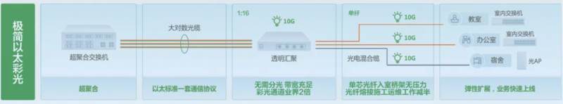 在湖南農業(yè)大學的數(shù)智校園建設中,教學辦公區(qū)采用彩光超聚合方案實現(xiàn)教室萬兆、辦公室2.5G的帶寬入室;宿舍區(qū)采用超融合方案覆蓋566間宿舍,統(tǒng)一運維平臺利舊保護投資,實現(xiàn)了“一張網(wǎng)”工程。