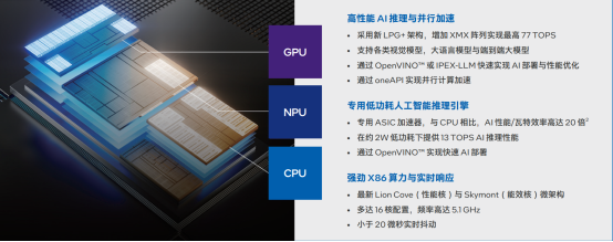 這顆 SoC,就是酷睿 Ultra 處理器。它在單一封裝內集成了 CPU、英特爾銳炫? GPU 和 NPU,并讓三者協同工作,AI推理能力、高性能CPU計算與工業級實時控制,“一手”拿捏。