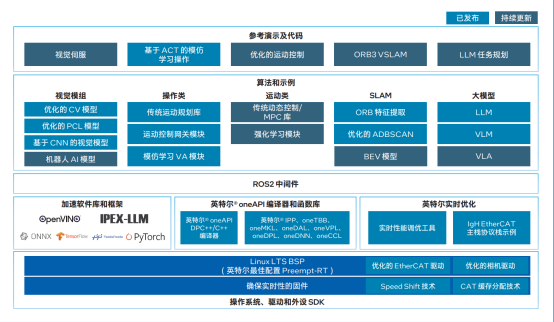 從“機器人看什么、怎么學、怎么動”,一直到系統層面的調度、驅動、實時控制,英特爾提供了全棧套件,開發者不用“零幀”起步。