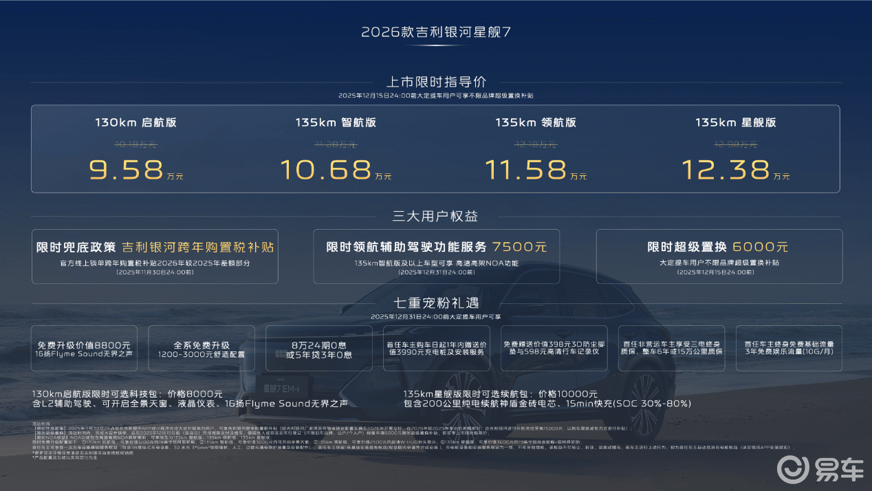 在新能源電混SUV領域,一款極具競爭力的車型——2026款吉利銀河星艦7EM-i正式登場,憑借在電池、續航、智能、安全、舒適五大維度的全面進階,迅速成為市場焦點。這款基于GEA新能源專屬架構打造的首款電混SUV,全系推出四個版型,分別是130km啟航版、135km智航版、135km領航版、135km星艦版,上市限時指導價9.58萬元—12.38萬元。即日起,用戶可通過吉利銀河APP、微信小程序、抖音小程序及官網等官方渠道下定,還能享受一系列限時用戶權益和寵粉禮遇。