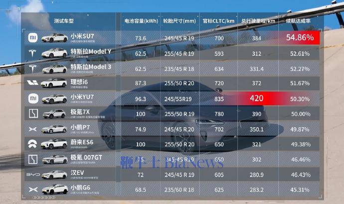 在這樣高強(qiáng)度的測試環(huán)境下,小米汽車旗下的兩款車型表現(xiàn)亮眼。小米YU7憑借出色的續(xù)航能力脫穎而出,最終續(xù)航里程達(dá)到了420公里,在所有參與測試的車輛中續(xù)航最長。而小米SU7則在達(dá)成率方面表現(xiàn)優(yōu)異,其達(dá)成率高達(dá)54.86%,成為達(dá)成率最高的車型。