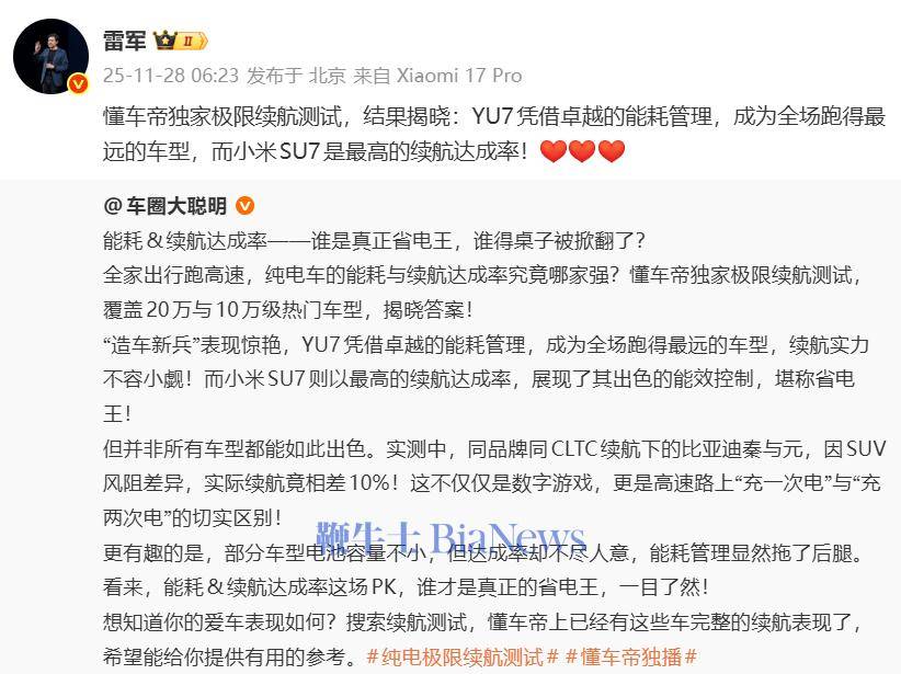 另一款車型小米YU7同樣備受矚目,其售價(jià)在25.35 - 32.99萬之間。該車同樣提供了后驅(qū)以及不同功率的雙電機(jī)四驅(qū)版本,零百加速時(shí)間在3.23 - 5.88秒不等,動力表現(xiàn)可圈可點(diǎn)。在續(xù)航上,小米YU7的CLTC續(xù)航里程為760 - 835km,為用戶的長途出行提供了有力保障。此次測試結(jié)果無疑為消費(fèi)者在選擇純電車時(shí)提供了重要的參考依據(jù)。
