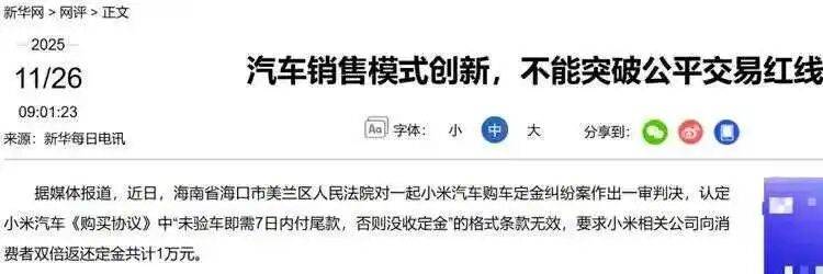 去年七月,消費者李女士支付五千元定金預訂小米汽車,合同明確約定"360天內可隨時排產"。然而年末突如其來的通知打破平靜:小米要求她七日內付清全款,否則定金不予退還。更令消費者難以接受的是,此時車輛尚未完成生產,更未進入驗車環節。這種"先付款后驗車"的流程,與行業通行的"驗車后付款"原則形成鮮明對比,引發廣泛質疑。