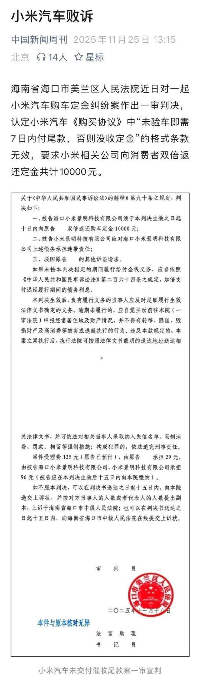 雷軍在社交媒體公布成績后,評論區迅速分化為兩大陣營。支持者強調"數據不會說謊",質疑者則翻出舊賬:今年5月推出的4.2萬元碳纖維機蓋選裝件,被曝存在宣傳與實際不符的問題。車主發現該配件不僅未帶來承諾的散熱性能提升,反而導致前備箱取消,而小米法務團隊"雷軍言論不代表技術事實"的回應,更被解讀為對品牌創始人的公開背棄。這場風波尚未平息,全國首例定金糾紛案的司法判決又添新傷——法院認定小米單方面修改付款條款的行為違反《消費者權益保護法》,相關格式條款被判無效。