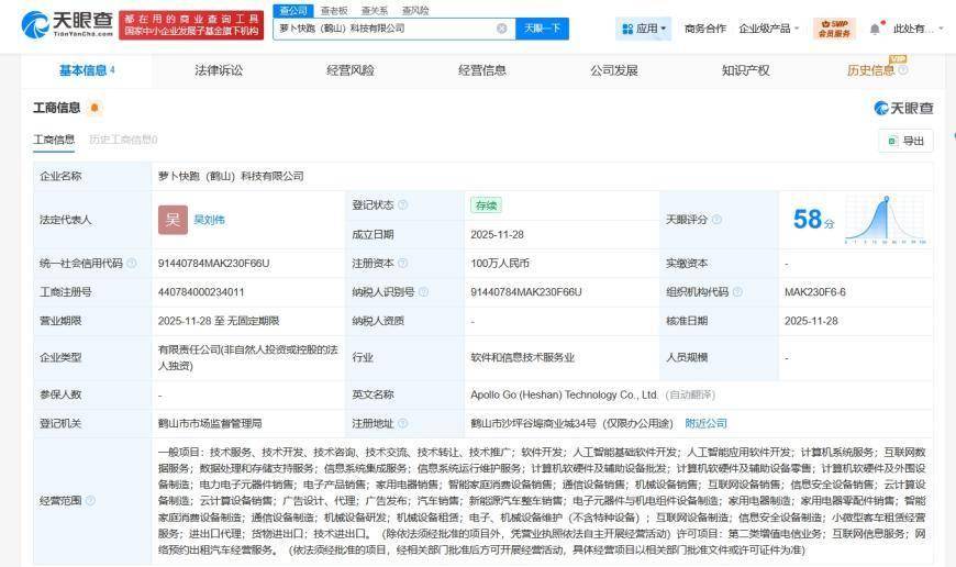 一家名為蘿卜快跑(鶴山)科技有限公司的新企業(yè)近期完成工商注冊登記,正式進入市場視野。據(jù)公開信息顯示,該公司法定代表人為吳劉偉,注冊資本設(shè)定為100萬元人民幣,由蘿卜運力(北京)科技有限公司全資控股。