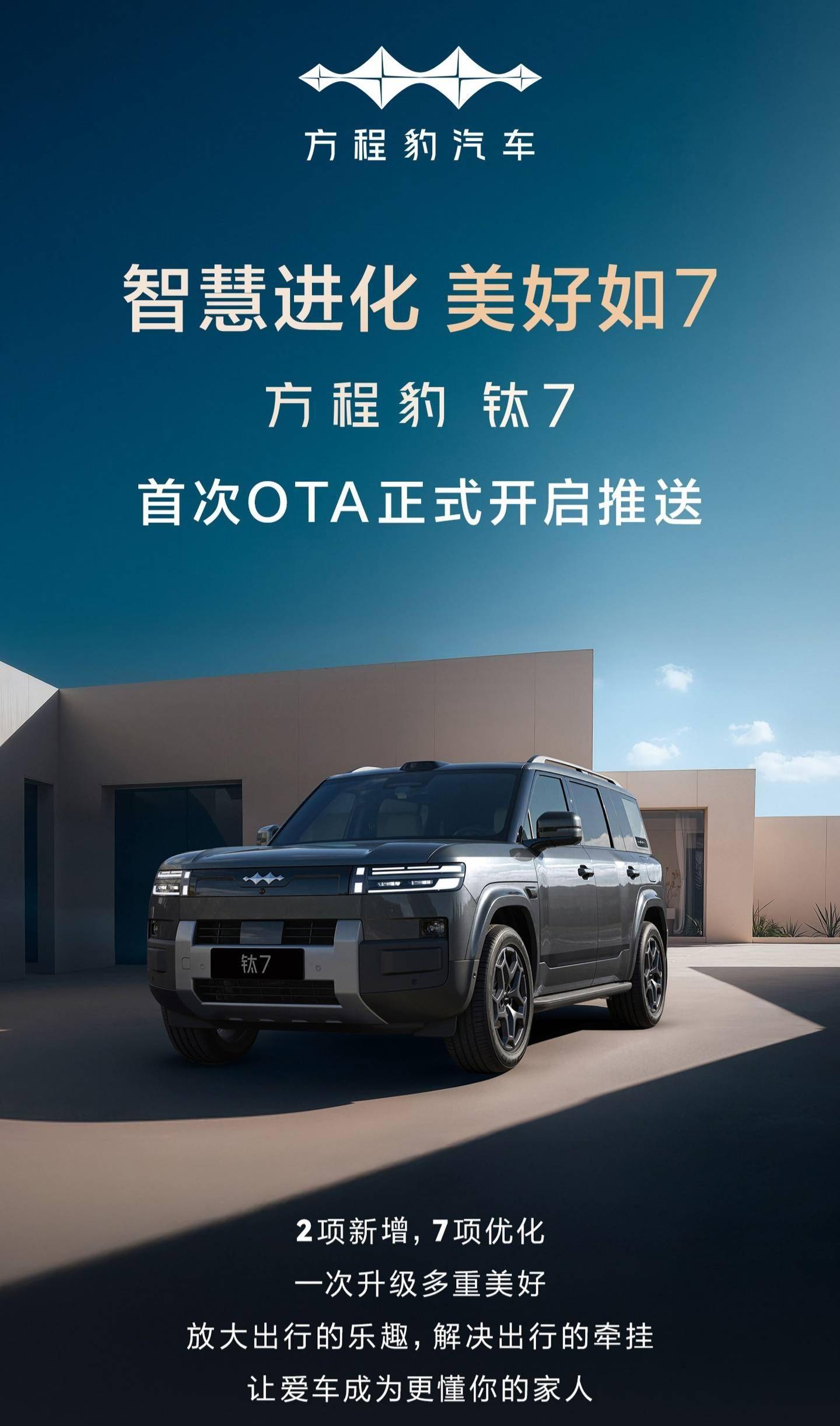 比亞迪方程豹汽車近日宣布,旗下鈦7車型正式啟動首次OTA升級推送,為車主帶來多項功能新增與體驗優化。此次升級覆蓋190KM四驅Ultra版車型,重點強化了智能互聯與駕乘舒適性,同時對充電策略和硬件性能進行針對性調整。