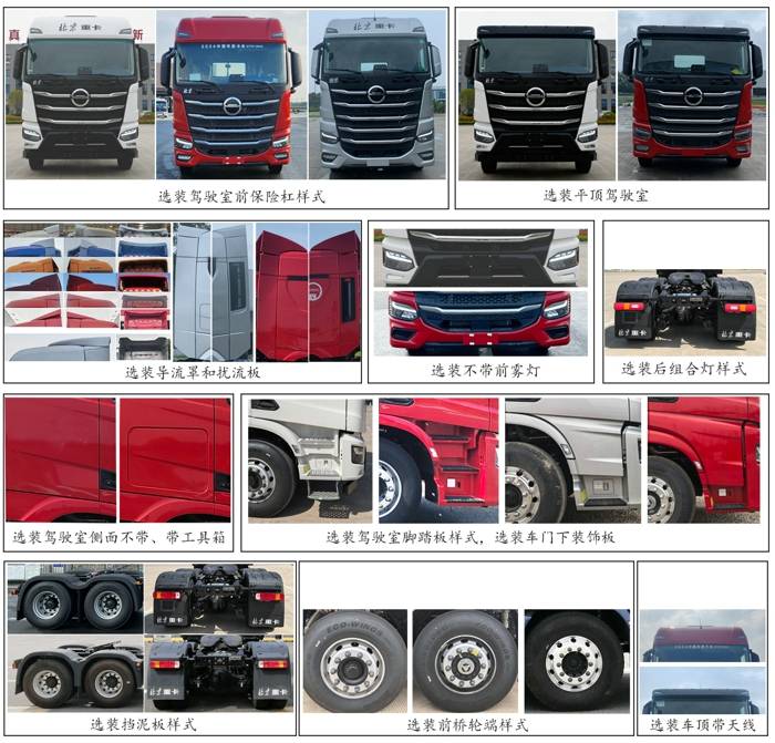 在個性化定制方面,這款新車展現出高度靈活性。根據公示的選裝方案,用戶可根據實際需求選擇不同風格的駕駛室前保險杠、平頂或高頂駕駛室、導流罩與擾流板組合。工具箱配置提供無工具箱、單側或雙側工具箱三種方案,車門裝飾板、腳踏板樣式、前橋輪端、擋泥板及后組合尾燈均支持多樣化選裝。車輛還可選配車頂天線,并支持前霧燈的增減配置。