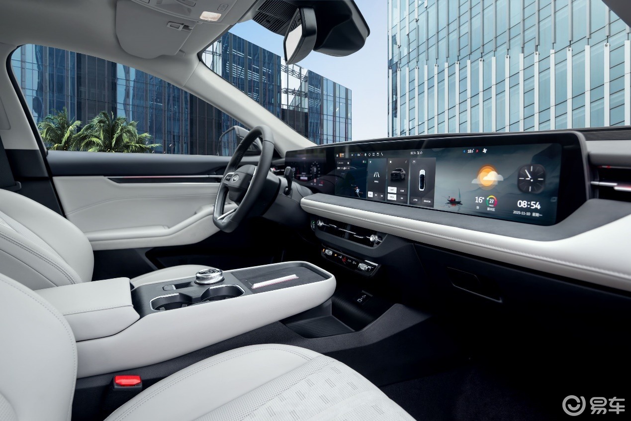進入車內,環抱式座艙設計帶來沉浸式體驗。中控臺搭載一塊長度達1.1米的27英寸4K分辨率屏幕,科技感十足。車內大面積采用軟質材料包裹,中央扶手區等細節處理精致,兼顧質感與舒適性。車機系統搭載高通驍龍8155芯片,運行新一代SYNC?+智行互聯系統,集成第四代智能語音助手,支持連續對話與全場景交互,并接入千億級參數大語言模型。STR快速啟動技術的運用,使車輛上電即可操作,大幅提升使用便捷性。