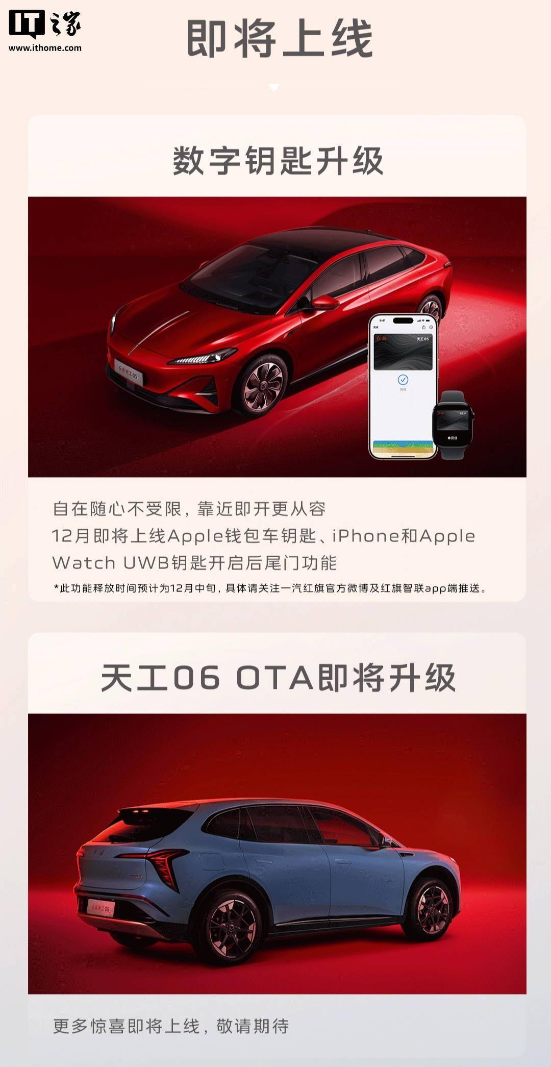 除OTA升級外,一汽紅旗還透露,天工05將于12月上線蘋果數(shù)字錢包車鑰匙功能,支持UWB超寬帶技術(shù)。用戶通過iPhone或Apple Watch即可解鎖車輛,并實現(xiàn)開啟后尾門等操作,進一步簡化用車流程。