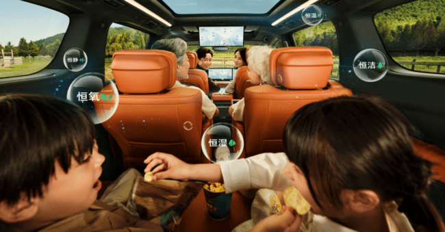 健康配置方面,至境世家首創“五恒”大健康座艙,通過恒溫、恒濕、恒氧、恒潔、恒靜技術打造舒適環境。座艙配備松下nanoe?X凈化技術、南德TüV護眼認證1.1米超長智慧頂燈,以及通過萊茵TüV低藍光認證的前后排娛樂屏。座椅皮革通過OEKO-TEX嬰兒級認證,電磁輻射值低于手機,為備孕家庭、嬰幼兒及佩戴心臟起搏器的敏感人群提供安全保障。
