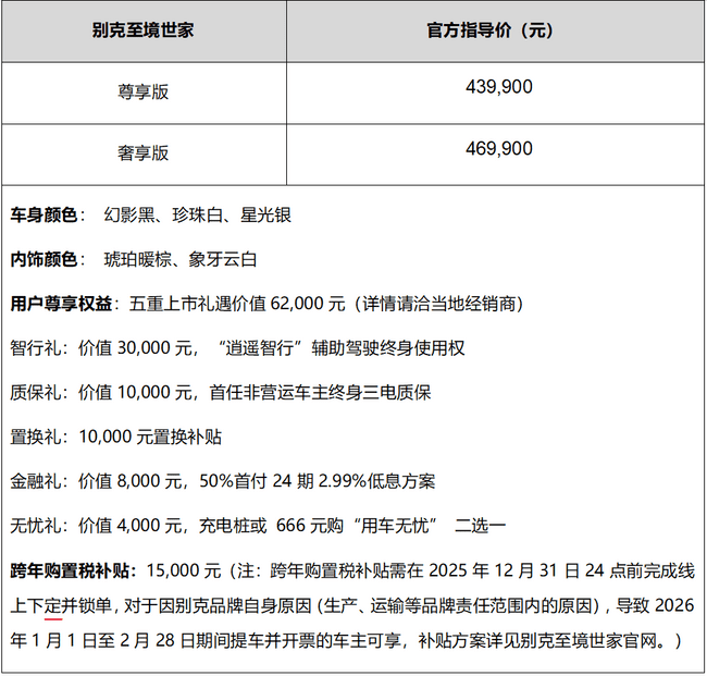 別克品牌近日正式推出高端新能源子品牌“至境”的旗艦MPV——至境世家,以“陸地灣流”為設計理念,將私人飛機的奢華美學融入汽車座艙,重新定義新能源MPV的豪華標準。這款車共推出尊享版和奢享版兩款車型,官方指導價分別為43.99萬元和46.99萬元,即日起可通過別克官網、iBuick App、全國授權經銷商等渠道接受預訂。