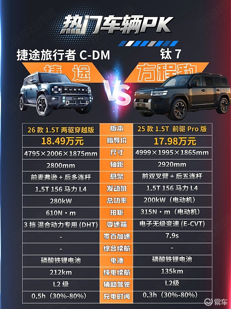 對于注重城市通勤與智能體驗,周末偶爾輕越野的消費者而言,方程豹鈦7憑借比亞迪的三電技術和L2級滿配輔助駕駛系統,能在復雜路況下提供更可靠的駕駛支持;而如果是續航需求較高、偏好硬派細節設計的用戶,捷途旅行者C-DM的212公里純電續航和側開尾門“小書包”設計,則能更好地滿足日常使用和輕度越野場景的需求。
