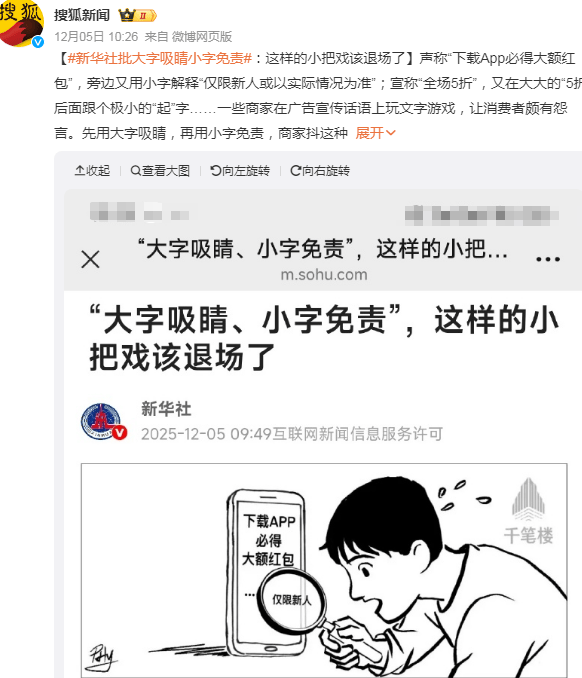 新華社近日刊發評論文章,直指這種營銷手段的危害。文章將此類行為概括為“三吹”:吹功效、吹銷量、吹優惠。以手機行業為例,某品牌在海報上用大字標注“超長續航”,小字卻注明“實驗室條件”;另一品牌宣傳“充電五分鐘通話兩小時”,實際需在“理想環境”下才能實現。這些看似夸張的宣傳,實則通過小字條款規避了責任。