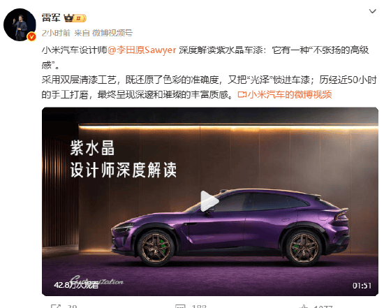 小米汽車創始人雷軍在社交平臺轉發設計師田原對紫水晶車漆的解讀時表示,這款配色“低調中透著高級感”。據介紹,該車漆采用雙層清漆工藝,通過特殊處理使色彩還原度更高,同時將光澤感牢牢鎖入漆面。從制作工藝來看,每一臺車的漆面都需經過近50小時的手工打磨,最終呈現出深邃與璀璨交織的獨特質感。