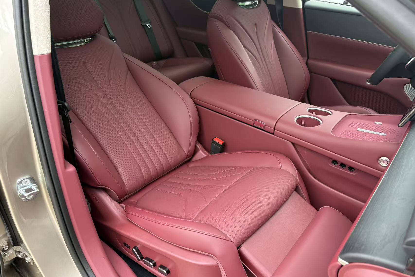 車尾部分,雙拼配色設計營造出濃郁的商務氣息,貫穿式尾燈則在沉穩中注入科技感。車身顏色方面,新車提供杜若白、玄英黑、金色、宸星灰4種單色車身,以及金色/紅色、金色/黑色兩種雙色車身,滿足不同消費者的個性化需求。步入車內,環抱式布局搭配真木裝飾與大面積皮質材質,營造出豪華舒適的駕乘環境。中控臺中央的16.1英寸3K屏幕內置鴻蒙智能座艙5.1系統,支持AI語音大模型與跨端交互,操作流暢且功能豐富。10.25英寸液晶儀表、AR-HUD抬頭顯示、50W手機無線充電面板以及四溫區空調的配備,進一步提升了車內的科技感與實用性。后排區域同樣亮點十足,8英寸液晶屏與車載冰箱的加入,為乘客提供了便捷的娛樂與舒適體驗。