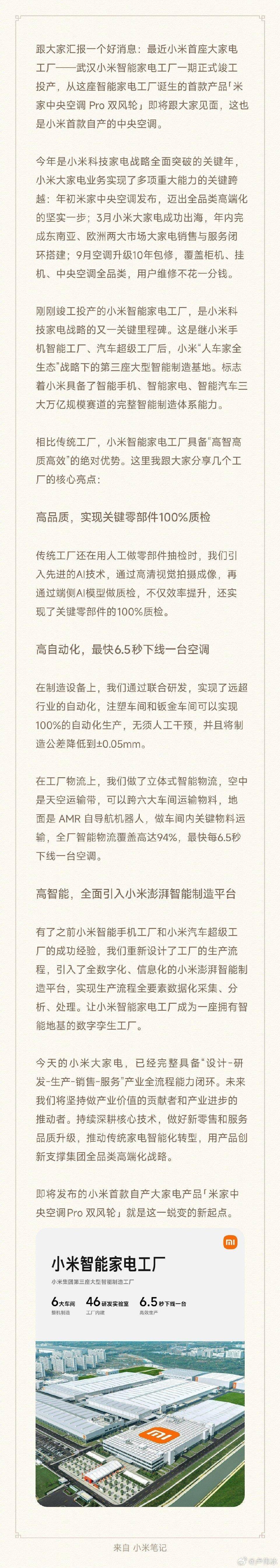 小米科技家電戰略迎來重要突破——武漢小米智能家電工廠一期項目正式竣工投產。這座標志著小米"人車家全生態"戰略落地的第三座智能制造基地,將率先量產米家中央空調Pro雙風輪,這也是小米首款自主生產的中央空調產品。