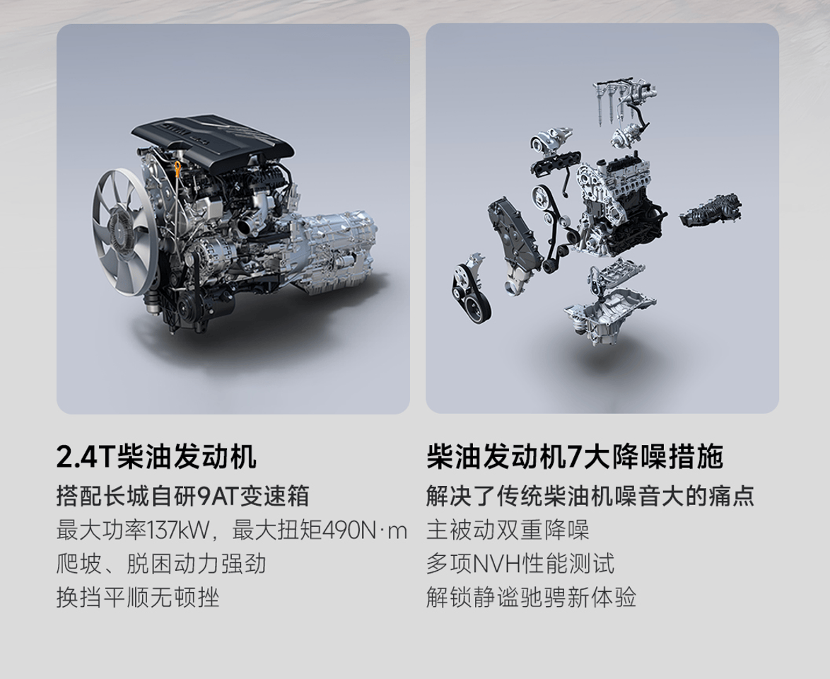 動力系統方面,新車搭載了一臺2.4T柴油發動機,最大功率為137kW,峰值扭矩達到490N·m。傳動系統匹配9速自動變速箱,并配備前后橋電控限滑差速鎖以及博格華納TOD適時四驅系統,確保車輛在復雜路況下的通過性和穩定性。這些升級使得新車在動力性能和越野能力方面均表現出色,能夠滿足消費者對高性能SUV的需求。