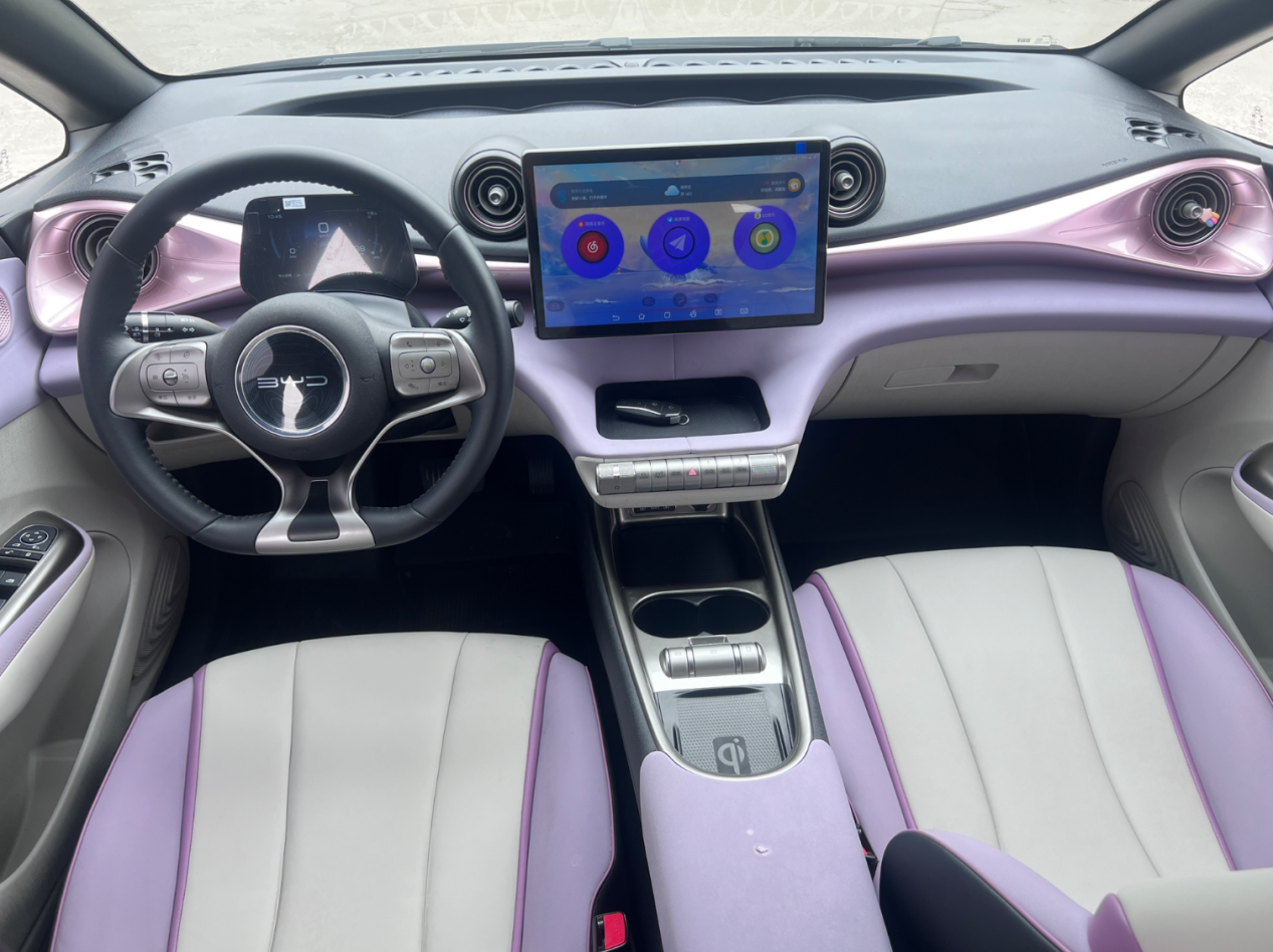 進(jìn)入車內(nèi),兩款車的“性格”差異更加明顯。比亞迪海豚的內(nèi)飾延續(xù)了海洋美學(xué)設(shè)計(jì),細(xì)節(jié)之處盡顯巧思。12.8英寸自適應(yīng)旋轉(zhuǎn)懸浮Pad是車內(nèi)的核心配置,搭配DiLink智能網(wǎng)聯(lián)系統(tǒng),支持語音控制、OTA升級等功能,反應(yīng)速度流暢,還能根據(jù)APP自動(dòng)旋轉(zhuǎn)橫豎屏,無論是追劇還是導(dǎo)航都十分方便。車內(nèi)用料十分良心,大面積采用軟質(zhì)包裹,搭配仿皮方向盤和一體式仿皮座椅,觸感細(xì)膩,完全不像10萬級車型的質(zhì)感。50W手機(jī)無線充電、后排隱私玻璃等配置實(shí)用性極高,女性駕駛者在補(bǔ)妝時(shí)隨手放置手機(jī)就能充電,無需糾結(jié)數(shù)據(jù)線問題。在空間利用率方面,海豚堪稱王牌,2700mm的超長軸距讓后排空間十分寬敞,175cm的女生坐進(jìn)去膝蓋仍有一拳半的余量,閨蜜三人同行也不會(huì)感到擁擠。儲物空間設(shè)計(jì)也十分貼心,前排中央扶手箱、門板儲物格、杯架布局合理,口紅、粉餅、鑰匙、奶茶等物品都能找到專屬位置,不會(huì)在中控臺亂糟糟地堆放。后備廂常規(guī)容積為345L,雖然不算超大,但日常購物、放置露營裝備完全夠用,后排座椅比例放倒后還能進(jìn)一步擴(kuò)展空間,偶爾裝載大件物品也不成問題。不過,有車主反饋,擋風(fēng)玻璃兩側(cè)立柱偏寬,轉(zhuǎn)彎時(shí)會(huì)產(chǎn)生一定的視野盲區(qū),女性駕駛者開車時(shí)需要多留意。