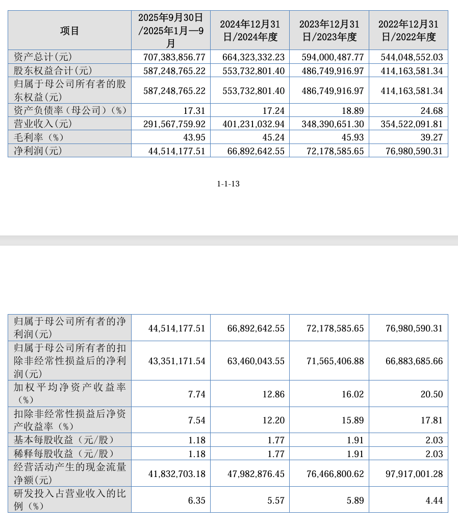 從財(cái)務(wù)數(shù)據(jù)來(lái)看,報(bào)告期內(nèi)(2022年至2025年三季度),佳宏新材的經(jīng)營(yíng)狀況呈現(xiàn)一定波動(dòng)。2022年?duì)I業(yè)收入為3.55億元,凈利潤(rùn)達(dá)7698.06萬(wàn)元;2023年?duì)I業(yè)收入微降至3.48億元,凈利潤(rùn)為7217.86萬(wàn)元;2024年?duì)I業(yè)收入回升至4.01億元,但凈利潤(rùn)進(jìn)一步下滑至6689.26萬(wàn)元;到2025年三季度,營(yíng)業(yè)收入為2.92億元,凈利潤(rùn)為4451.42萬(wàn)元。