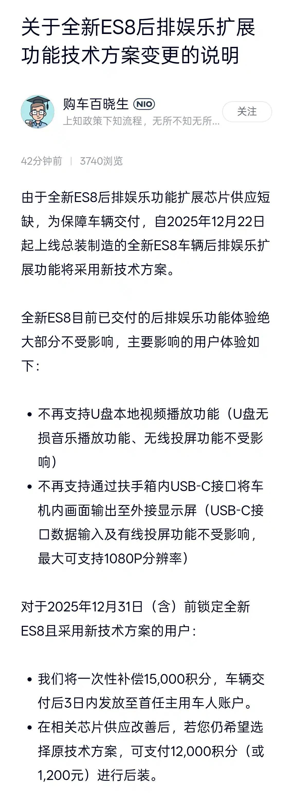 為彌補用戶因技術方案調整可能帶來的體驗差異,蔚來推出了相應的補償措施。對于在2025年12月31日(含)前鎖定全新ES8訂單并采用新技術方案的用戶,蔚來將一次性發放15000積分作為補償。這些積分將在車輛交付后的3日內,自動發放至首任主用車人的賬戶中。蔚來還承諾,在相關芯片供應情況改善后,若用戶仍希望選擇原技術方案,可支付12000積分(或等值1200元)進行后裝升級。