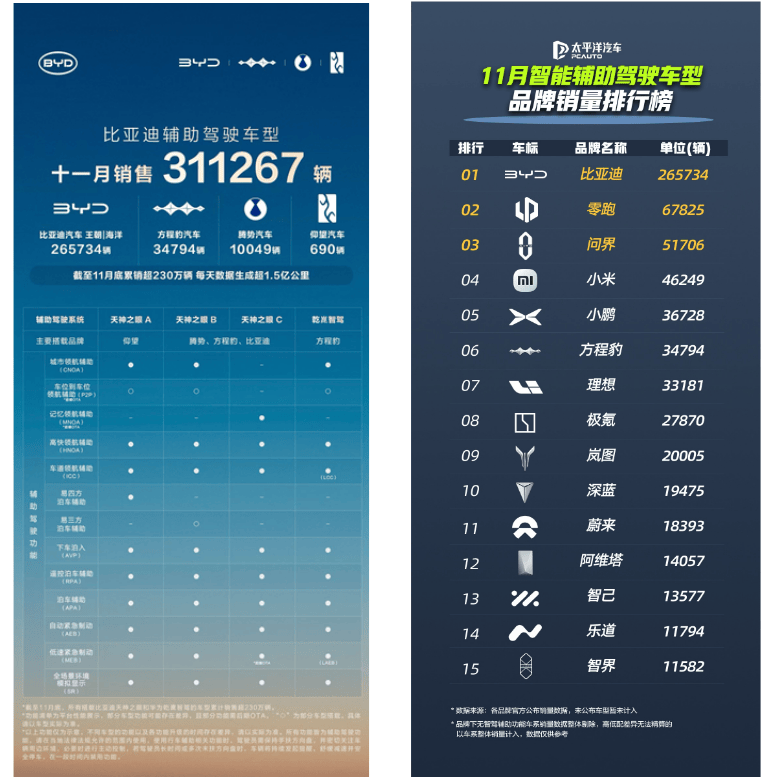 比亞迪近日公布了其搭載“天神之眼”輔助駕駛系統(tǒng)的車型銷售成績,再次以亮眼數(shù)據(jù)領(lǐng)跑市場。數(shù)據(jù)顯示,11月全月銷量突破31萬輛,達(dá)到311267輛,延續(xù)了其在智能駕駛領(lǐng)域的領(lǐng)先優(yōu)勢。其中,王朝與海洋系列貢獻(xiàn)了265734輛,而方程豹、騰勢、仰望等高端及個性化品牌也表現(xiàn)出色,共同構(gòu)建了比亞迪在智能駕駛領(lǐng)域的多元化產(chǎn)品矩陣。