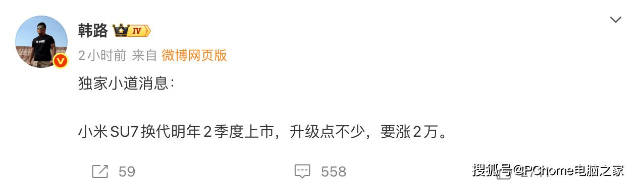 近日,汽車行業資深博主韓路在社交平臺透露了一則關于小米汽車的最新動態:小米SU7換代車型計劃于2026年第二季度正式上市,新車型在性能、智能駕駛、座艙體驗及底盤技術等方面均有顯著升級,同時起售價將上調2萬元至23.59萬元。