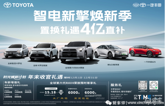 為回饋用戶支持,一汽豐田在12月推出“智電新擎煥新季”活動,投入4億元廠家直補。全球第六代RAV4榮放2.0L雙擎精英版官方指導價16.98萬元,限時煥新價15.18萬元,還可疊加享受6000元購置稅補貼與6年6次免費基礎保養(yǎng)及6年或10萬公里整車質保服務。皇冠陸放、格瑞維亞、普拉多等車型可享至高1.3萬元車齡增值禮,卡羅拉DAY活動還提供專屬到店禮等服務,為消費者創(chuàng)造高性價比購車時機。