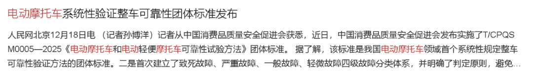 中國消費品質量安全促進會近日正式推出《電動摩托車和電動輕便摩托車可靠性試驗方法》團體標準(T/CPQS M0005—2025),標志著我國電動摩托車行業首次建立起覆蓋整車可靠性驗證的系統性規范。這一標準的出臺,不僅填補了國內相關領域的技術空白,更被視為推動產業升級的關鍵舉措。