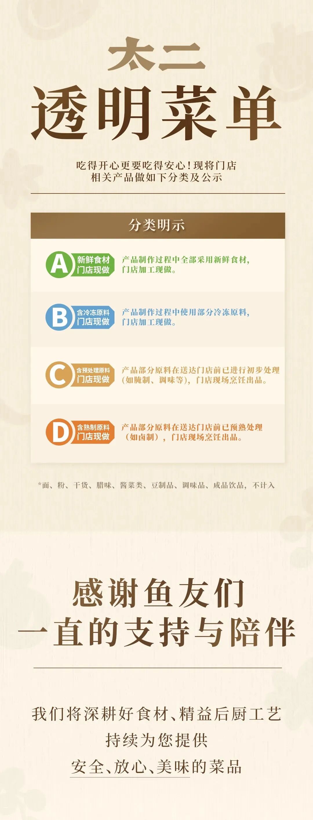 太二酸菜魚官方表示,這一制度不僅適用于自身品牌,還同步覆蓋了母公司九毛九集團旗下的多個餐飲品牌。消費者可以根據菜單分類,直觀選擇不同食材處理方式對應的菜品,滿足多樣化的飲食需求。此次改革體現了品牌對食材品質和透明度的重視,也為行業樹立了新的標桿。