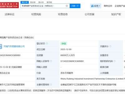 奇瑞汽車等成立新產業投資合伙企業 出資額6.6億