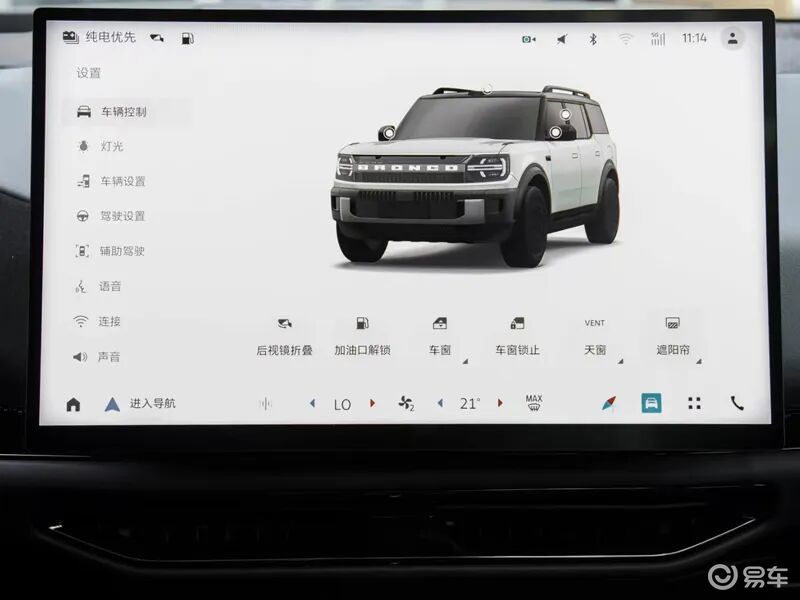 設計層面,智趣烈馬延續了福特家族標志性的硬派美學。方正的車身輪廓搭配貫穿式鍍鉻飾條,勾勒出力量感十足的視覺效果;可點亮的“BRONCO”標識與橫向雙層燈帶組合,進一步強化了前臉的野性氣質。車身側面采用寬體輪眉、黑色側踏板及大尺寸越野輪胎,懸浮式車頂設計則增添了時尚感。車尾部分,豎向排列的LED尾燈與外掛式備胎形成呼應,側向開啟的后備廂門兼顧實用性與硬派風格。尺寸方面,增程版與純電版車型長寬高分別為5025/1960/1825(1815/1840)mm及5025/1960/1815(1825)mm,軸距均達2950mm,提供寬敞的乘坐空間。