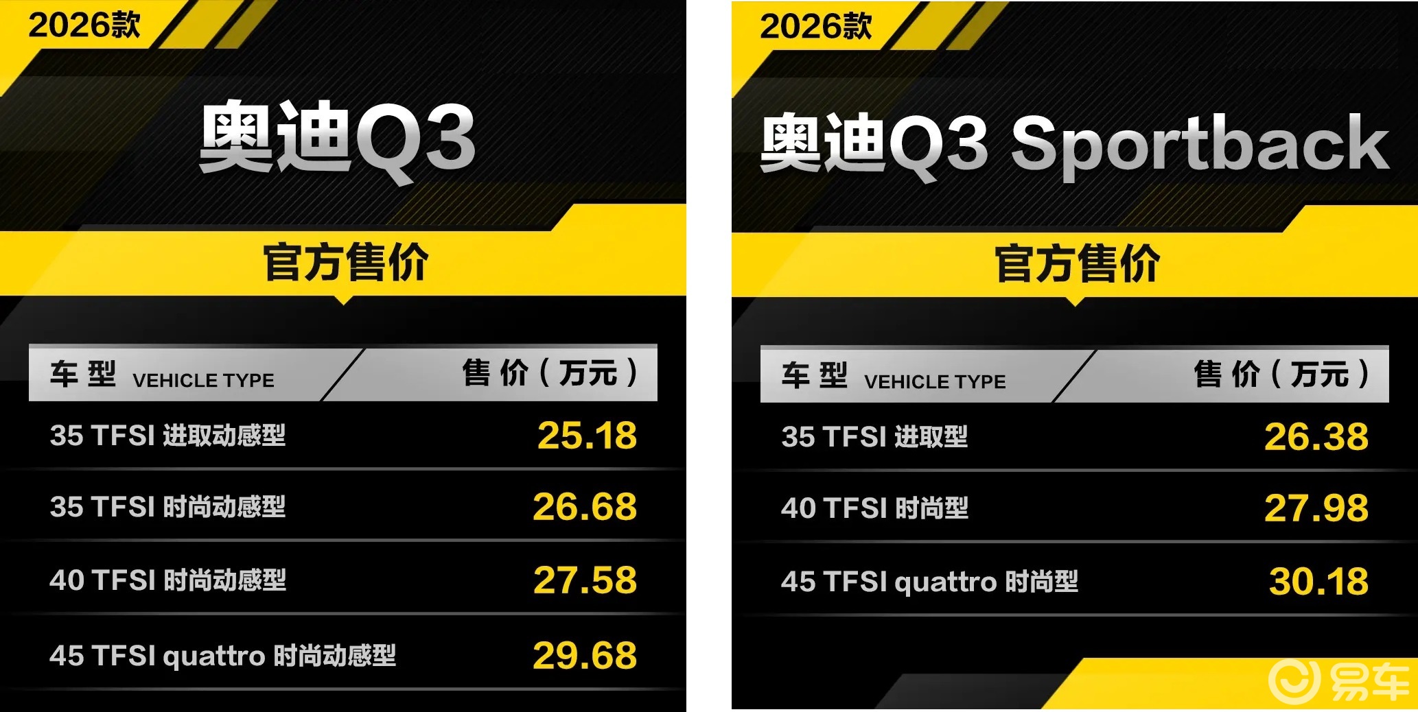 一汽奧迪近日宣布,2026款奧迪Q3家族正式登陸市場。此次推出的新車陣容涵蓋Q3標準版與Q3 Sportback轎跑版兩大系列,共計7款配置車型,官方指導價區間設定為25.18萬元至30.18萬元,為消費者提供了豐富的選擇空間。