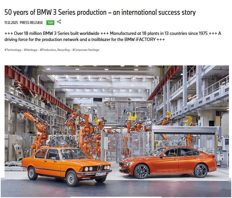 寶馬集團近日宣布,旗下經典車型寶馬3系全球累計產量正式突破1800萬輛大關。自1975年首代車型問世以來,這款標志性產品已在全球13個國家的18座工廠完成生產,成為寶馬集團全球化布局的重要支點。