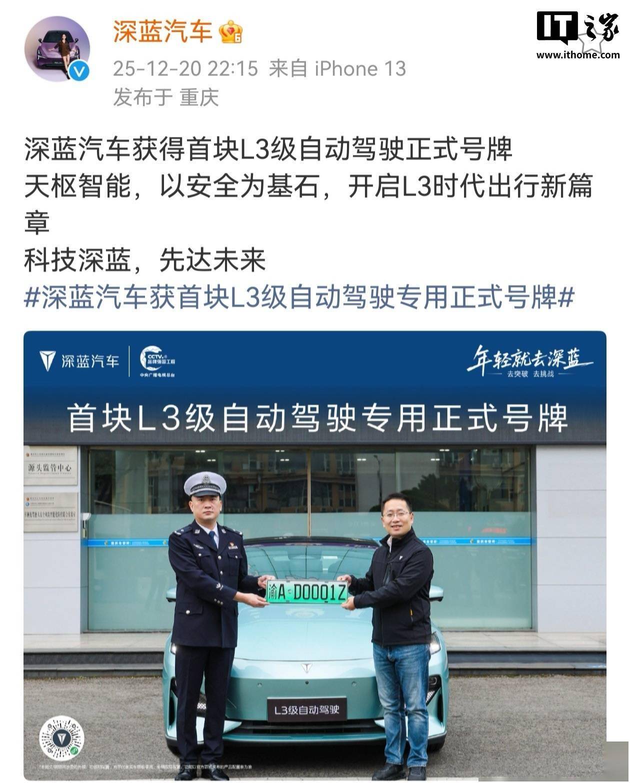 長安深藍汽車斬獲首塊L3級自動駕駛號牌,自動駕駛商業化邁出關鍵步伐